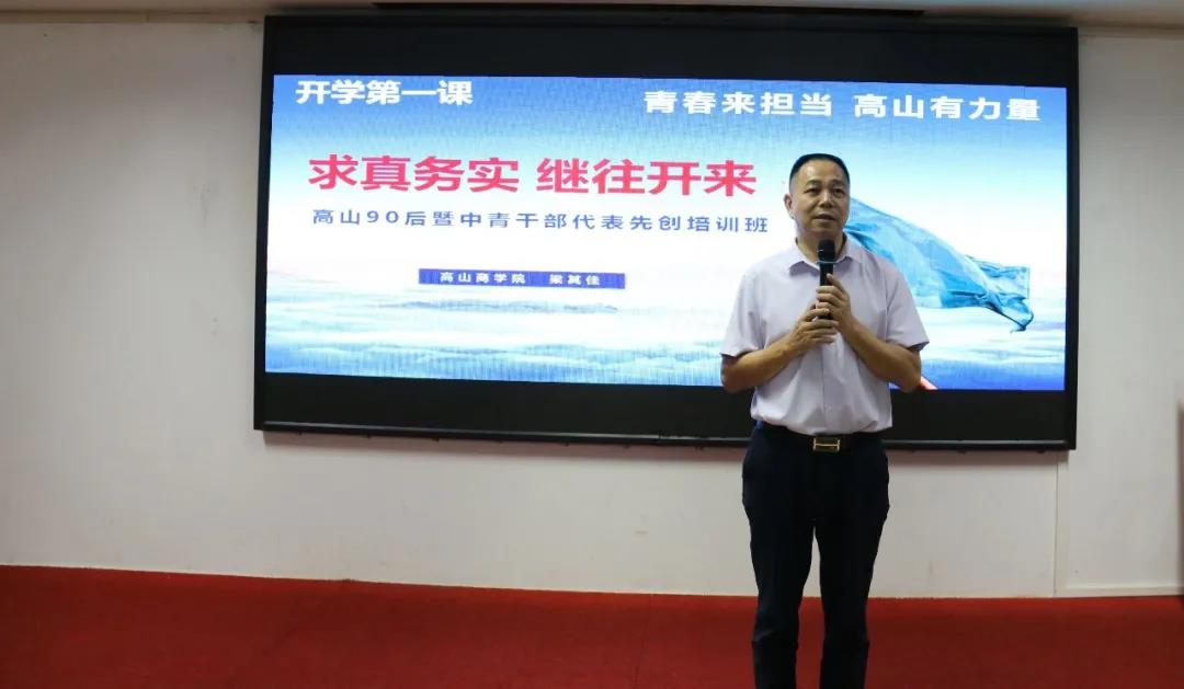 廣東海洋大學客座教授、高山集團董事長梁其佳在培訓班上作了開班第一課的《求真務實,繼往開來》講話,勉勵大家在求實中奮進,在奮進中團結,在守正中創新,在創新中發展。革命來擔當,青春有力量,百年健康高山,在干部,在青春,在未來。我們必須在不斷變化的市場中適應市場,萬眾一心,團結一致,凝聚力量,繼往開來。實現健康百年高山,不斷創新邁向輝煌!