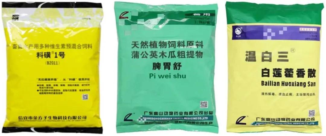 夏天,畜禽因暑、濕、痢引發的各類拉稀證狀(包括呼吸道型拉水、拉稀等):藿香正氣口服液按4ml/L水,或者藿香正氣散4kg/噸料,連用3-5天。聯合料磺1號1kg/噸料效果更佳。
