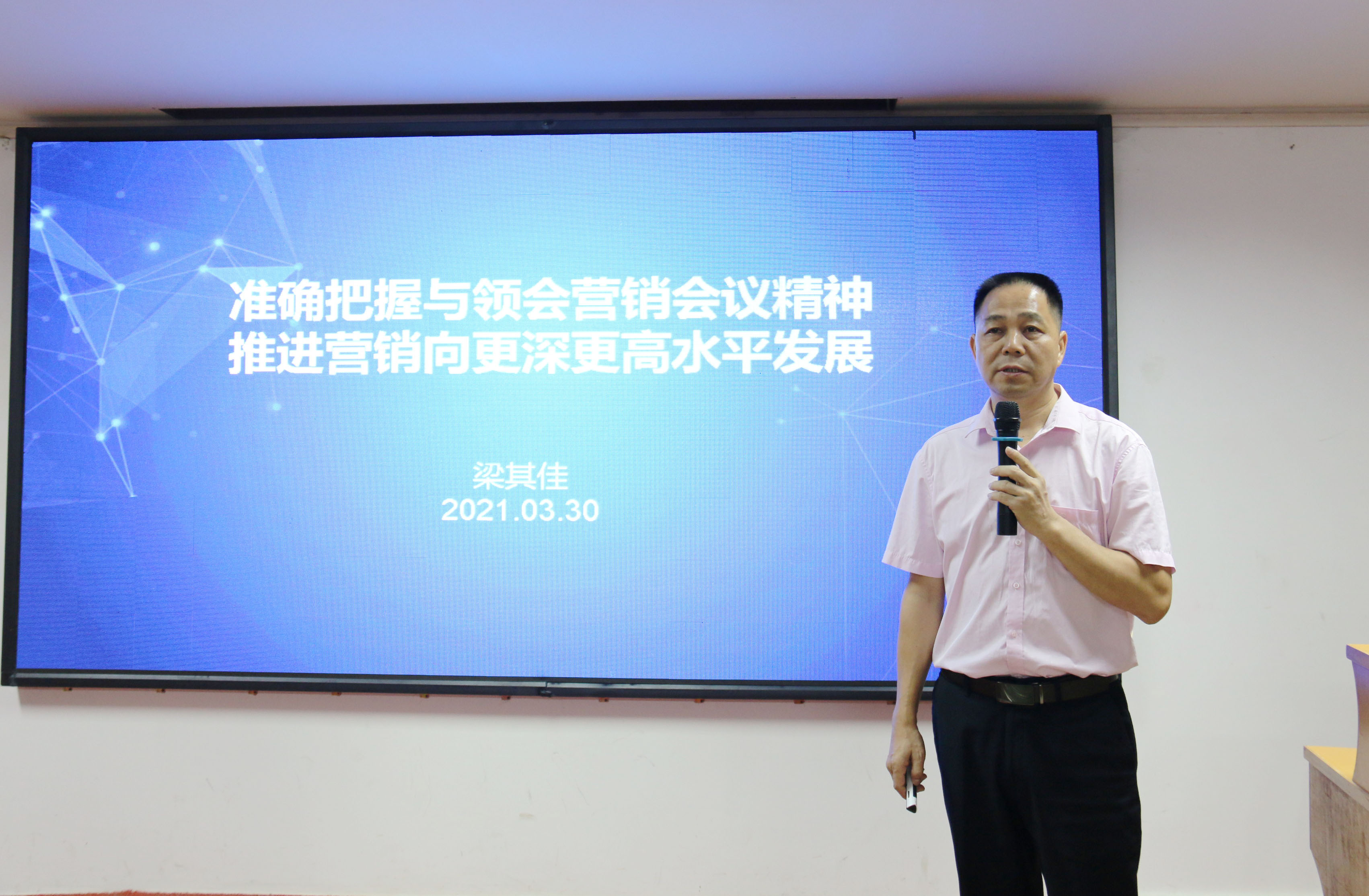 接著,梁董事長作了《準確把握與領會營銷會議精神,推進營銷向更深更高水平發展》主題報告,從當前營銷工作的目標方向、2021年營銷工作的關鍵詞、2021年營銷工作的開展、2021年營銷推廣的著力點等四個方面展開闡述,要求大家準確把握與領會最近幾次營銷會議精神,貫徹推進營銷工作向更深更高水平發展,以“據點營銷”實現更深更寬,以“中藥功能保健”實現更高水平,體現“更大、更寬、更廣、更高、更專、更細”。