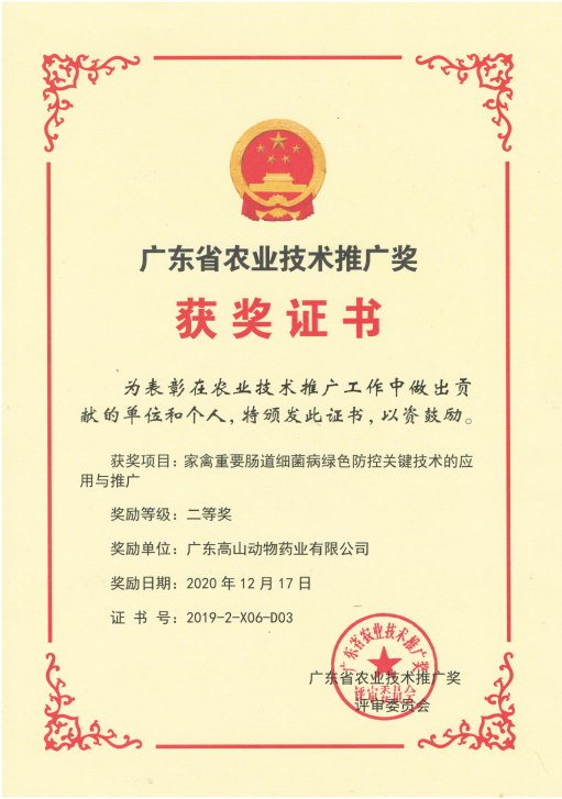 熱烈祝賀廣東高山動物藥業有限公司的“家禽重要腸道細菌病綠色防控關鍵技術的應用與推廣”項目榮獲2020度廣東省農業技術推廣項目二等獎,并于近日獲得廣東省農業農村廳頒發獲獎證書。