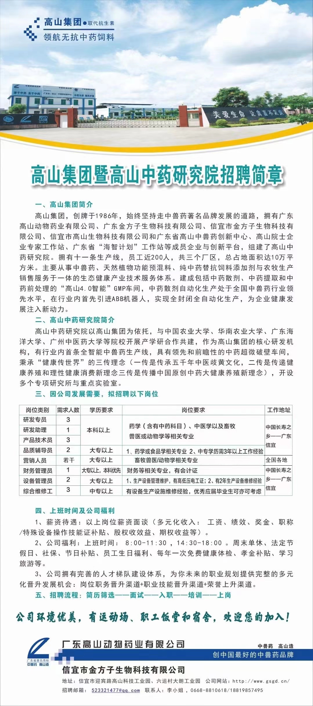 中獸藥,高山造。高山,創牌于1986年,是一間100%從事中獸藥的國家高新技術企業,為優質肉蛋奶提供最健康的中藥解決方案是我們的服務宗旨。根據集團業務發展的需要,現面向全國、不分區域、扁平發展的中藥定制營銷業務,現面向全國定向招聘營銷經理和銷售經理若干名。