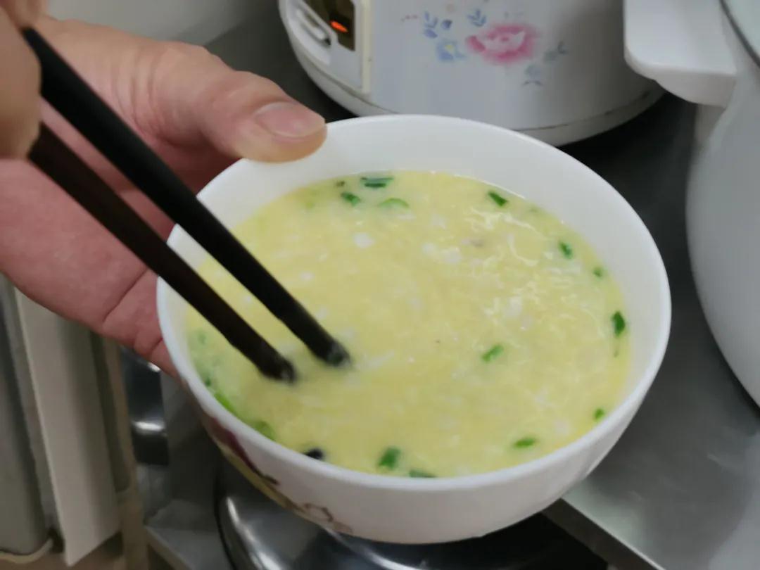 第二步,把1-2個雞蛋打入碗里,然后加入姜絲適量,食鹽、花生油適量,依個人口味可加入豆豉3-5粒,蔥花少許,沖入生滾硬米粥,攪拌即食。