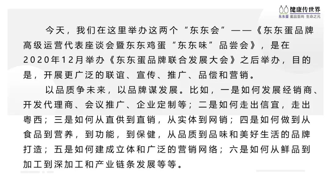 2021年2月2日,東東蛋業(yè)(廣東)有限公司在高山集團(tuán)總部舉辦《東東蛋品牌高級運(yùn)營代表座談會》,來自粵桂兩地的東東蛋運(yùn)營商、品牌聯(lián)合發(fā)展商、品牌推廣運(yùn)營商、東東蛋消費(fèi)代表等近二十人參加了座談會。