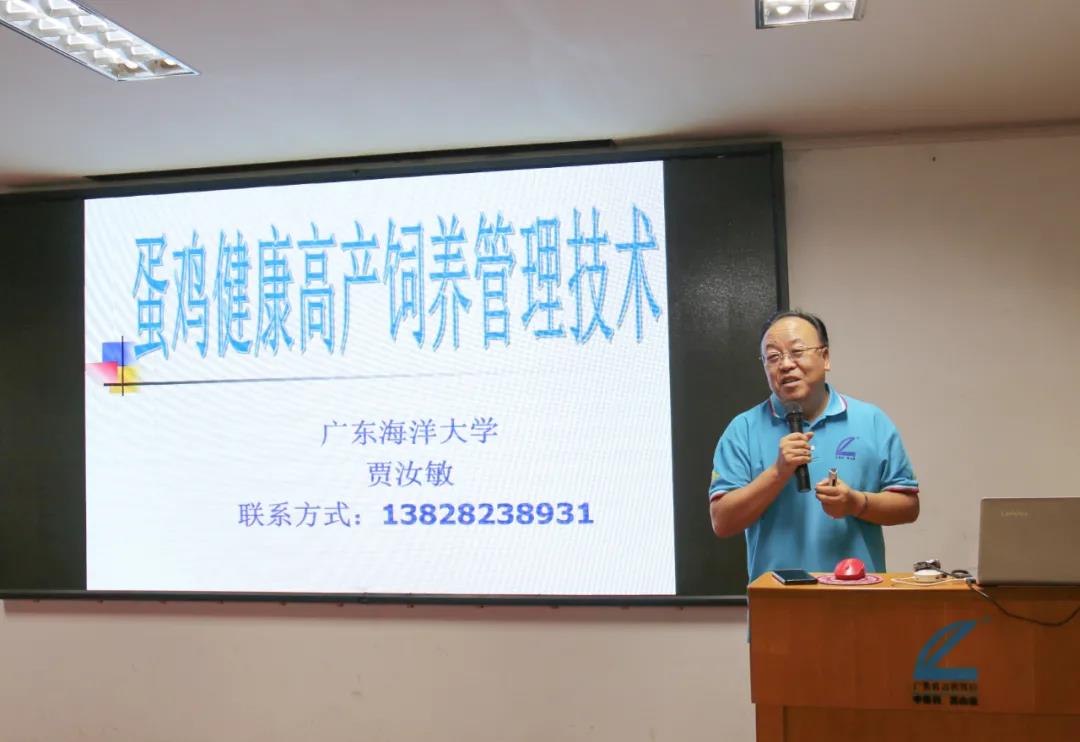 廣東省水禽產業技術體系崗位專家、廣東省農村科技特派員、廣東海洋大學濱海農業學院動物科學系賈汝敏教授作《蛋雞健康高產飼養管理技術》報告,首先介紹了我國蛋雞產業現狀以及過去四十年全球雞蛋產量發展趨勢和變化。并指出蛋雞的無抗健康養殖通過采取:優質雞苗+科學管理+優良飼料+良好環境+合理保健具體措施,從而提高蛋雞自身免疫力和抗病力,讓蛋雞養殖過程中保證不使用抗生素,以及抗生素的濫用造成的危害。還提出現在的蛋雞健康生產的五要素:雞苗方面(根本)+飼料方面(基礎)+環境方面(條件)+管理方面(核心)+疾病防控(精髓)。
