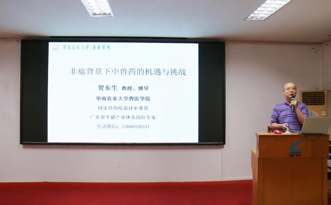 華南農業大學獸醫學院教授、博士、博士生導師、國家農業部獸藥疫苗評審委員會委員、生豬產業體系豬病崗位科學家賀東生教授作《非瘟背景下中獸藥的機遇與挑戰》和《當前豬病的流行動態和防控策略》報告,首先介紹了非洲豬瘟是豬的一種急性、熱性、傳染性極強的高度接觸性傳染病及其危害,深刻剖析提升豬病的防控能力豬場生存和獲取高利潤的核心關鍵,常用非瘟防控技術可以概括為1個中心、2個基本點、3個面4項技術,共12項技術策略。最后,賀東生教授為大家介紹了中獸藥防控非瘟的理論和實踐應用。