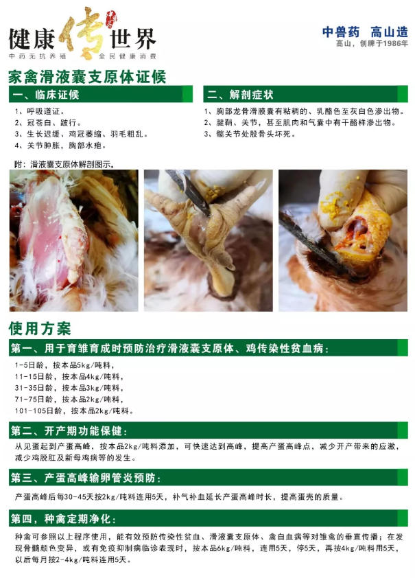 5、滑液囊支原體。祖代場出現的滑液囊支原體造成商品廠放量,與傳統的滑液囊支原體不盡相同,髖關節不吃力,軟骨組織消失、變形。脛骨的骨質薄如紙。對整個蛋雞行業危害大于任何疾病,注射無效。治療效果微乎其微,該病是免疫抑制病,保健預防大于治療。1-5日齡(6公斤)、11-15日齡(5公斤)、31-35日齡(4公斤)、71-75日齡(3公斤)、101-105日齡(2公斤)使用免增粵威龍。不僅僅針對滑液囊支原體,也解決了所有的因為免疫抑制帶來的疾病,如貧血病,馬立克病,法氏囊病等。