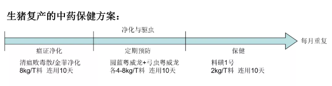 中藥防控清瘟敗毒方案:方案1:清瘟敗毒散或金菲8kg/噸料,連用10天后,再用圓藍粵威龍+弓蟲粵威龍散各按2-4kg/噸料+料磺1號2kg/噸料,連用10天。每月重復。方案2:清瘟敗毒散按8kg/噸料+弓蟲粵威龍2-4kg/噸料,連用10天。每月重復使用。