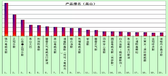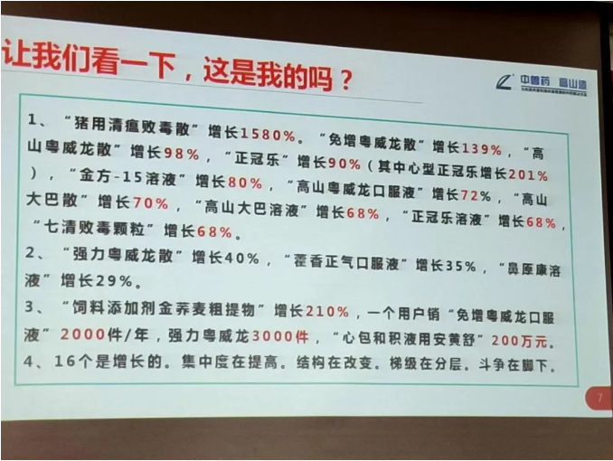 中藥產品增長亮點閃閃,代表單品有,“豬用清瘟敗毒散”增長1580%?!懊庠龌浲埳ⅰ痹鲩L139%,“高山粵威龍散”增長98%,“正冠樂”增長90%(其中心型正冠樂增長201%),“金方-15溶液”增長80%,“高山粵威龍口服液”增長72%,“高山大巴散”增長70%,“高山大巴溶液”增長68%,“正冠樂溶液”增長68%,“七清敗毒顆?!痹鲩L68%。“強力粵威龍散”增長40%,“藿香正氣口服液”增長35%,“鼻原康溶液”增長29%。“飼料添加劑金蕎麥粗提物”增長210%。