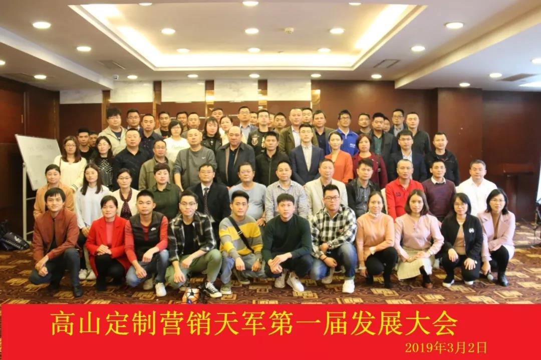 2019年3月2日,高山定制營銷天軍第一屆發展大會在廣州市華鉅君悅大酒店召開。大會主題是“天網地網”互聯,高山定制天軍,健康與您始終同行。來自全國各省區的天軍、區域天軍運營中心經理及有意向加盟天軍的嘉賓代表等80多人參加了本次大會。本次會議由高山集團常務副總經理黎來鳳主持。