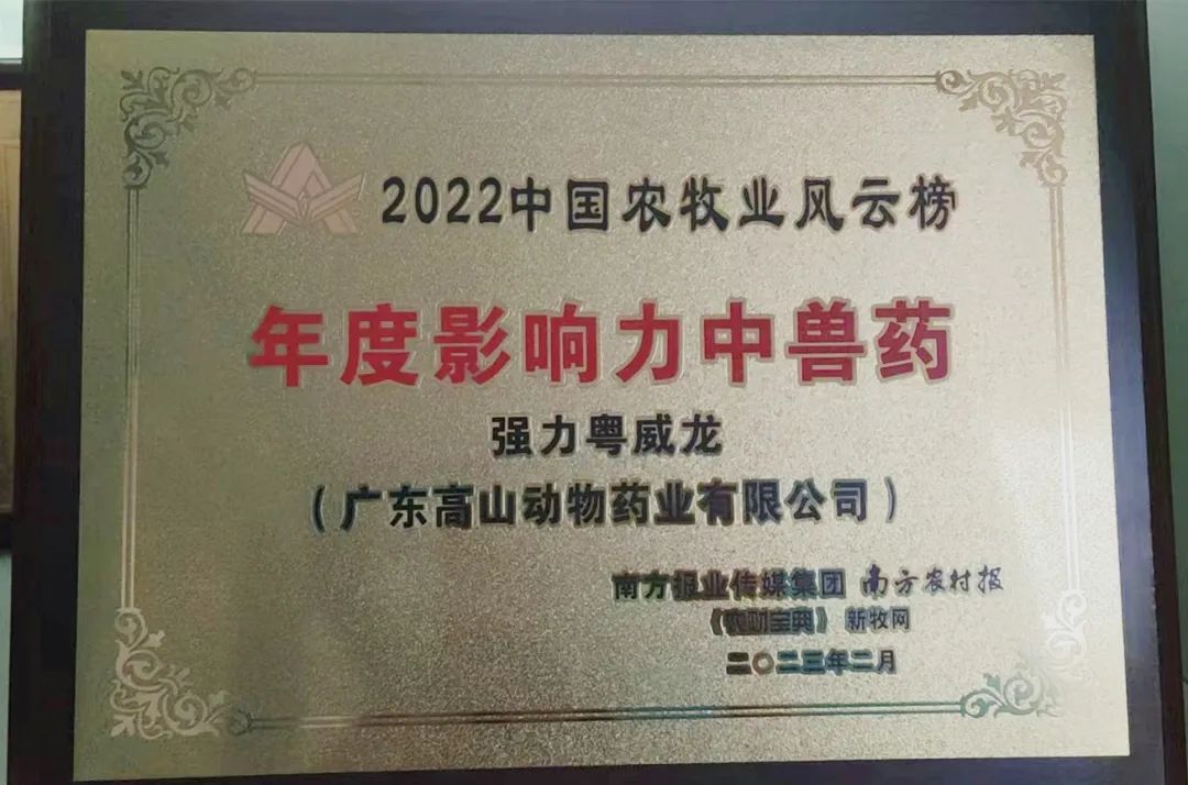 三、強(qiáng)力粵威龍榮獲2022中國農(nóng)牧業(yè)風(fēng)云榜之“2022年度影響力中獸藥”稱號(hào)。