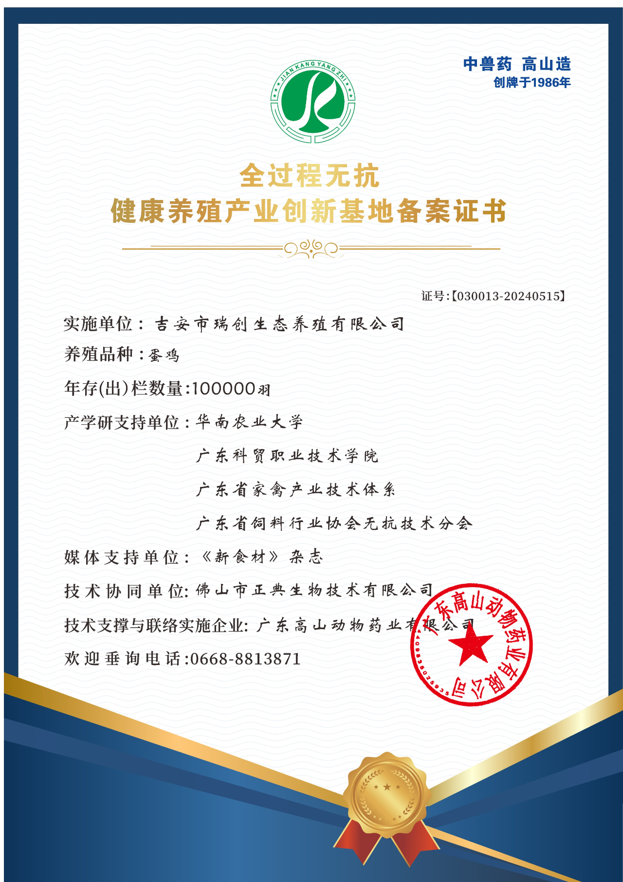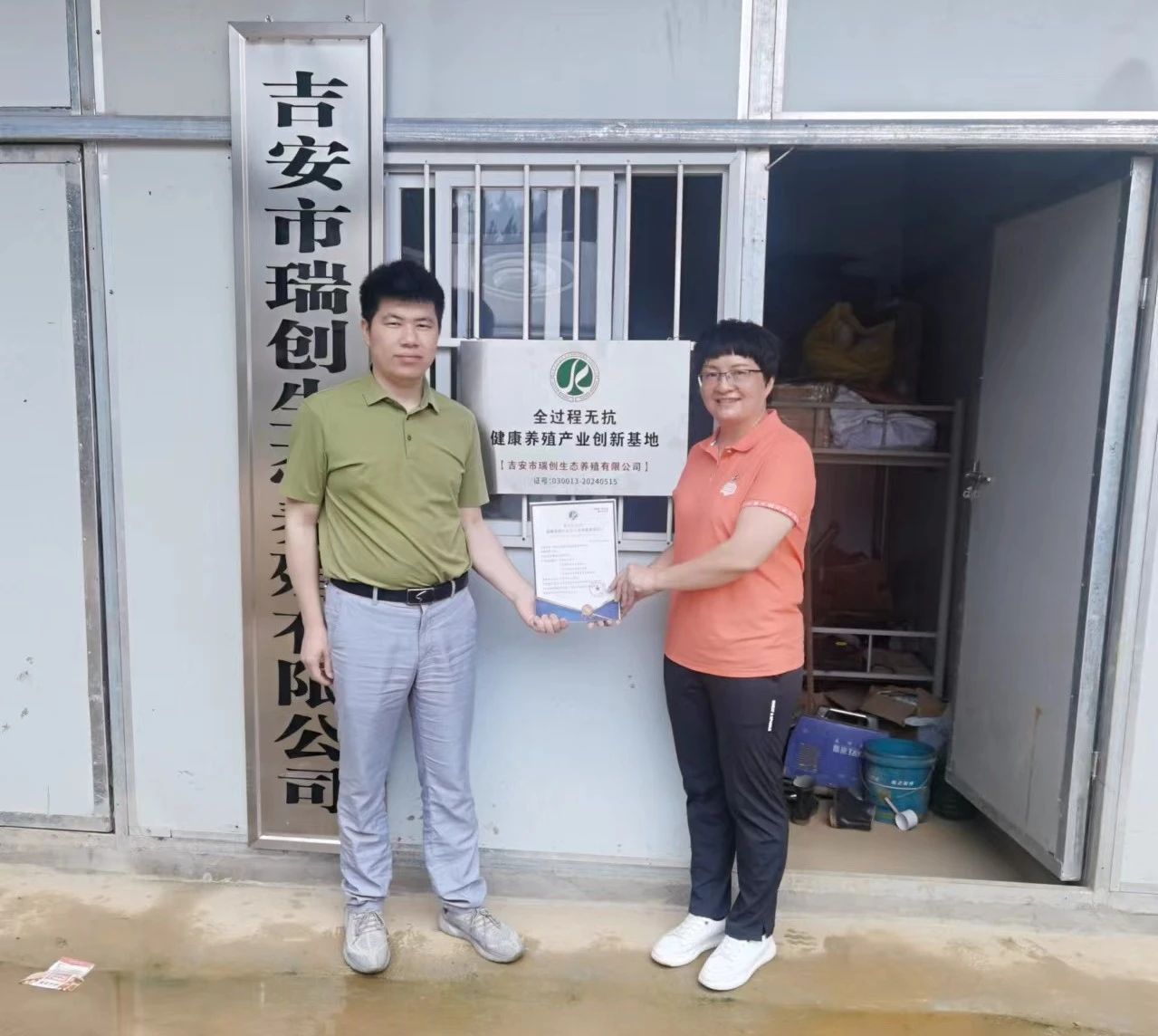 2024年5月25日,吉安市瑞創生態養殖有限公司掛牌《全過程無抗健康養殖產業創新基地》牌匾并授予證書,瑞創的負責人彭聰總經理,從2019年加盟高山“1+1”形象店,到瑞創生態養殖有限公司,從認同中醫中藥大健康理念到大健康無抗養殖踐行者;這是校企合作和省際合作的的重要成果,也是在全過程無抗蛋雞養殖產業創新發展道路上邁出堅實的一步。推動蛋品向更安全和更優質的方向前進,為人民群眾提供安全、健康與優質的食品。