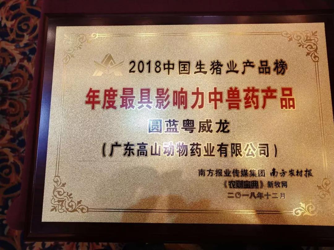 據新牧網報道,2018年12月16日,由南方報業傳媒集團主辦,南方農村報、《農財寶典》新牧網承辦的“2018中國生豬業風云會既《農財寶典》新牧網年會”在廣州盛大舉行。經過前期激烈的網絡投票,以及專家評委綜合評選,廣東高山動物藥業有限公司旗下產品——圓藍粵威龍(芪參散)成功斬獲“2018年度最具影響力中獸藥產品”的殊榮。