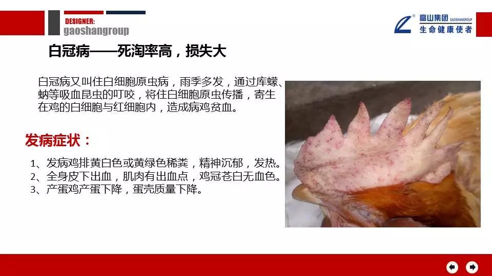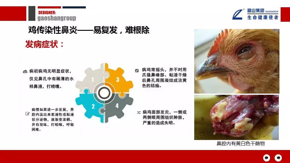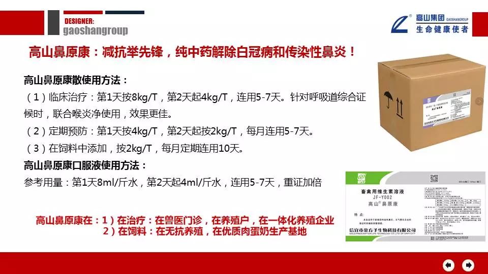 3、白冠病和傳染性鼻炎。這兩個(gè)病貫穿春夏秋冬季節(jié),交錯(cuò)流行。從3月開始,長(zhǎng)江流域,從5月開始,黃河流域發(fā)生較多。傳播速度快,死亡率高,生產(chǎn)性能丟失多,是這個(gè)病的共性,損失巨大。用高山鼻原康,鼻原康發(fā)病即用,按4kg/噸,重證8kg/噸,連用5天,用了馬上見效,與磺胺類藥成本對(duì)比相差不大,且效果最確切。