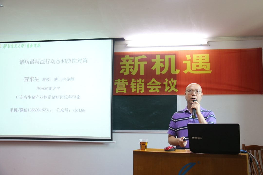 華南農業大學獸醫院教授、博士、博士生導師、國家農業部獸藥疫苗評審委員會委員、生豬產業體系豬病崗位科學家賀東生作了《豬病最新流行動態和防控對策》報告。