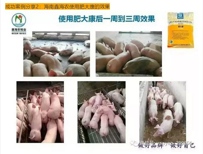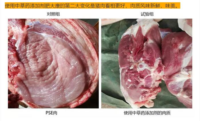 肥大康具有健康、安全和高效等中藥獨特優勢,增重、止痢,尤其是改善肉質效果獨特。從60斤體重起用至出欄,有效改善PSE肉現象,提高屠宰率達80%以上,對比增重可達10~16斤/頭,投入1元可帶來遠遠大于8元以上的額外收益,高性價比,更具有比其他合成類產品無與倫比的品質優勢和傳統中藥獨特的安全優勢,是最新中藥特色應用成果專利技術轉化的產品。