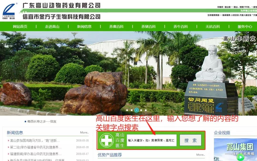 首先在計算機或手機終端上瀏覽,輸入網址www.bournemouthbridalmakeup.com搜索到“廣東高山動物藥業有限公司官網”點擊進入以下網站頁面(圖一),找到“高山百度醫生”(圖二),在“搜索”上輸入你想要信息的關鍵字。
