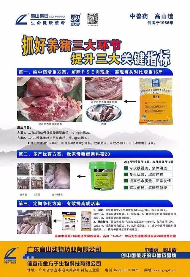 2017年10月30日,第六屆華南(茂名)畜牧博覽會在化州市康景體育館成功開幕。高山集團參展的產(chǎn)品主要有:純中藥增重育肥,解決PSE肉問題的肥大康;所有母豬實現(xiàn)多生優(yōu)育都可以用的料磺20;定期凈化使用,有效提高成活率的圓藍粵威龍和弓蟲粵威龍。