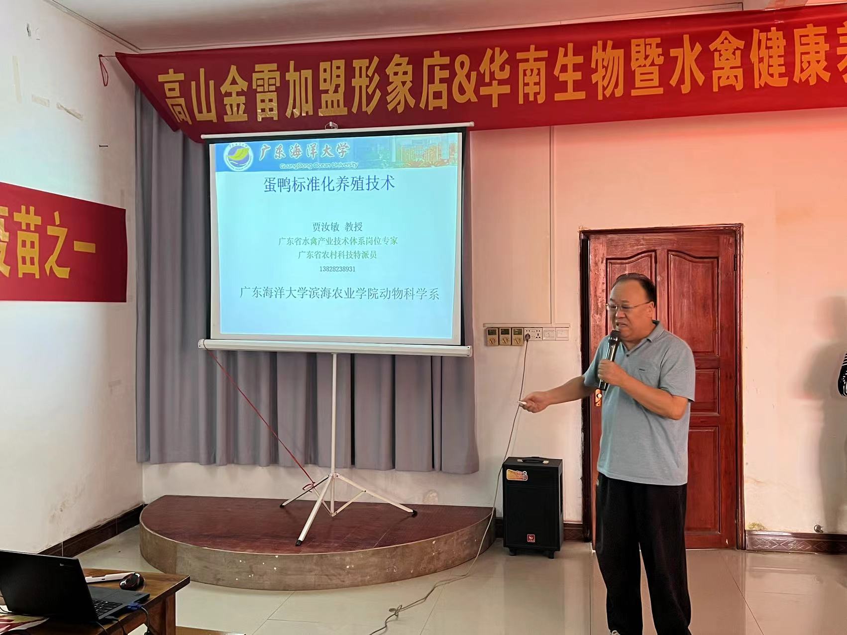 廣東省水禽產業(yè)技術體系崗位專家、廣東省農村科技特派員、廣東海洋大學濱海農業(yè)學院動物科學系賈汝敏教授作《蛋鴨標準化養(yǎng)殖技術》報告,首先詳細介紹我國蛋鴨產業(yè)現(xiàn)狀和蛋鴨的品種,深刻剖析蛋鴨的標準化養(yǎng)殖技術,同時指出蛋鴨養(yǎng)殖面臨的主要問題及原因是產蛋量不高、平均體重不夠、整齊度不好、產蛋高峰期短、發(fā)病多發(fā)病急、蛋鴨淘汰早和養(yǎng)鴨不掙錢,最后分享了蛋鴨高產穩(wěn)產的關鍵是全程使用高山中藥無抗大健康養(yǎng)殖預防保健方案。