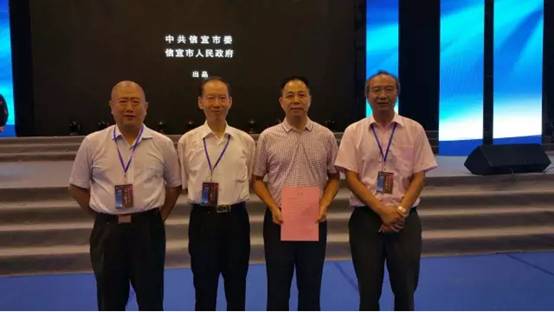 中國畜牧獸醫學會夏有彩副秘書長、吉林大學韋旭斌教授、中國畜牧獸醫學會中獸醫分會穆詳會長向高山集團贈遞中國畜牧獸醫學會中獸醫分會賀信合影