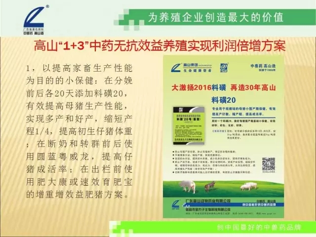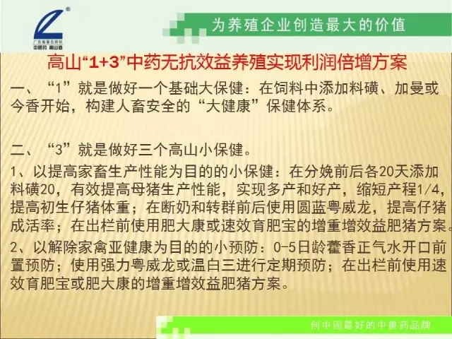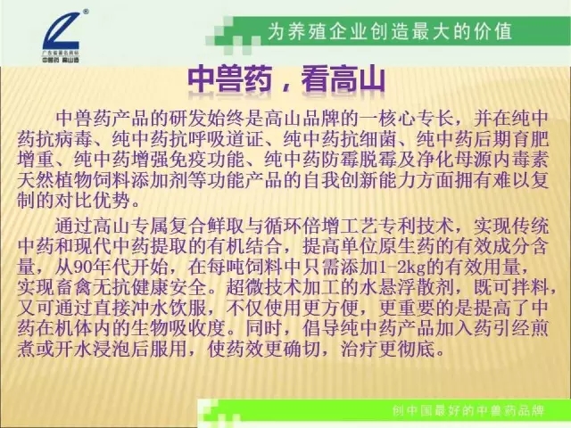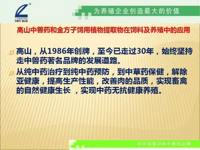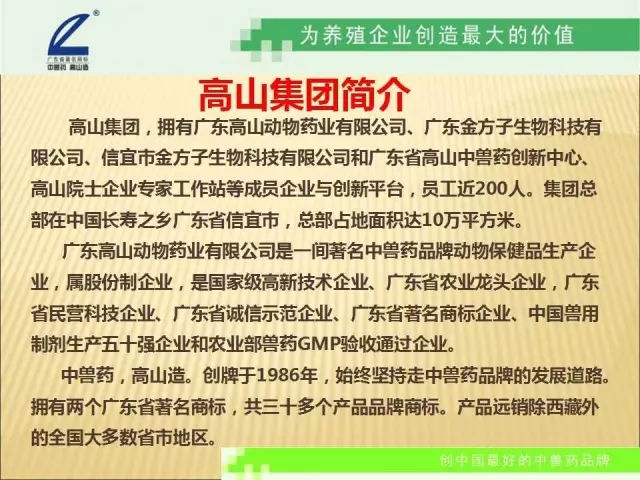 高山,從1986年創(chuàng)牌,走過(guò)30年,始終堅(jiān)持走中獸藥著名品牌的發(fā)展道路。從純中藥治療,到純中藥預(yù)防,到中草藥保健,解除畜禽亞健康,提高生產(chǎn)性能,改善肉的品質(zhì),實(shí)現(xiàn)畜禽的自然健康生長(zhǎng) ,實(shí)現(xiàn)中藥無(wú)抗健康養(yǎng)殖。