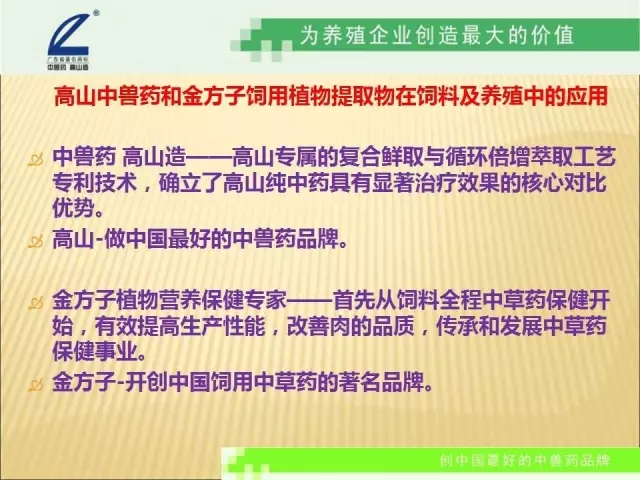 金方子植物營(yíng)養(yǎng)保健專家。首先從無(wú)抗飼料全程中草藥保健開始,有效提高生產(chǎn)性能,改善肉的品質(zhì),傳承和發(fā)展中草藥保健事業(yè)。開創(chuàng)中國(guó)飼用中草藥的著名品牌。