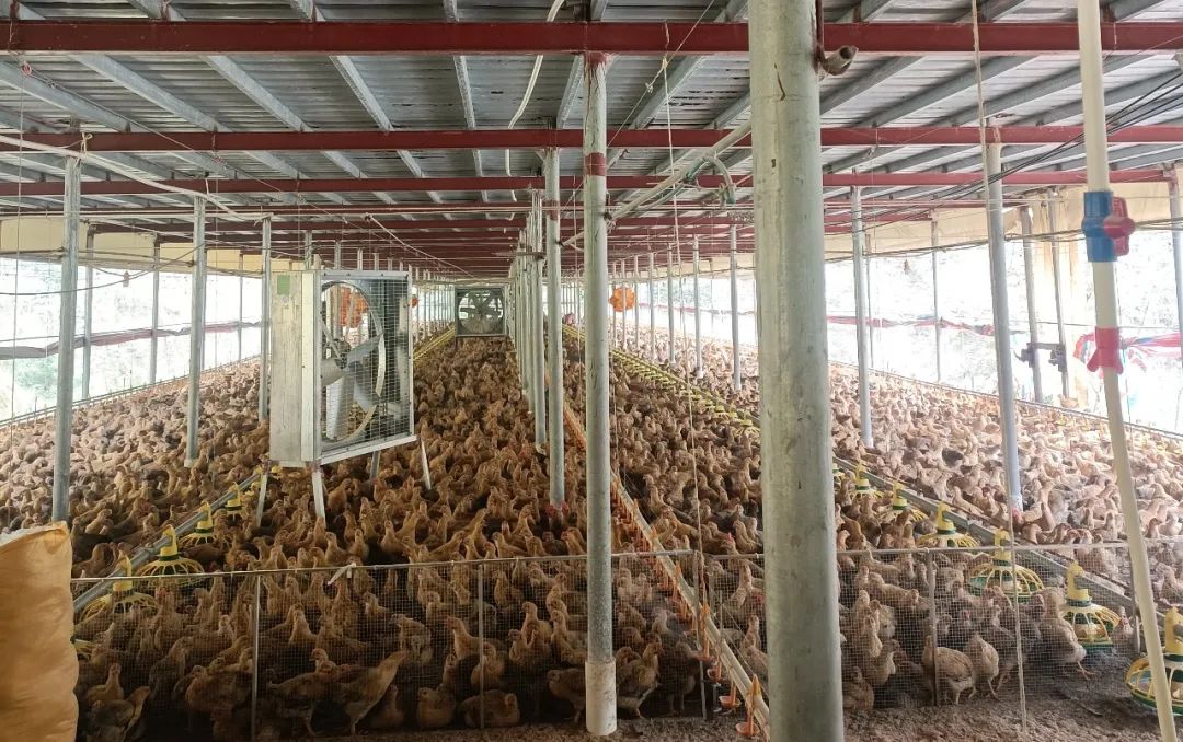 宇辰農(nóng)牧董事長(zhǎng)江維波、總經(jīng)理陳甫周帶領(lǐng)大家參觀考察三層現(xiàn)代化肉雞立體養(yǎng)殖場(chǎng)。