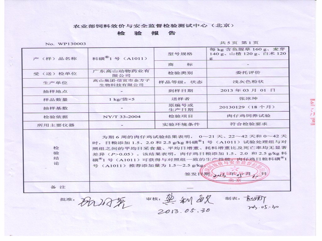 國家農(nóng)業(yè)部飼料工業(yè)中心,即國家飼料工程技術(shù)研究中心關(guān)于高山集團生產(chǎn)的替抗天然植物飼料添加劑產(chǎn)品——料磺1號和加曼100的兩個試驗報告的附注說明: