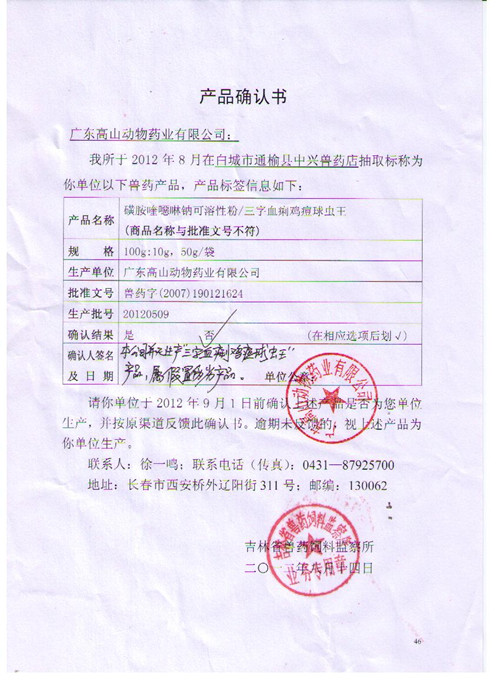 如近期在廣西省百色市被抽檢的“炎瘟一片救活(商品名)”、吉林省被抽檢的“三字血痢雞痘球蟲王”并非公司生產,該抽檢產品為假冒產品,現向廣大消費者溫馨提示:廣東高山動物藥業有限公司的產品擁有公司專有的、統一的、規范的包裝視覺系統,以及產品代碼和防偽電話系統,公司的業務人員均佩戴有公司的工作證和公司徽章。擁有公司合法的、完整的、正規的銷售渠道和網絡,敬請廣大消費者從公司直管的各省區渠道進貨,并認準廣東高山動物藥業有限公司的產品,謹防上當受騙。廣東高山動物藥業有限公司是高新技術企業、廣東省誠信示范企業、同時擁有兩個廣東省著名商標,接受名牌商標保護。假冒產品是嚴重違反獸藥管理條例和商標保護相關法律法規的違法行為。公司保留對下述假冒產品銷售行為的進一步追究權利。