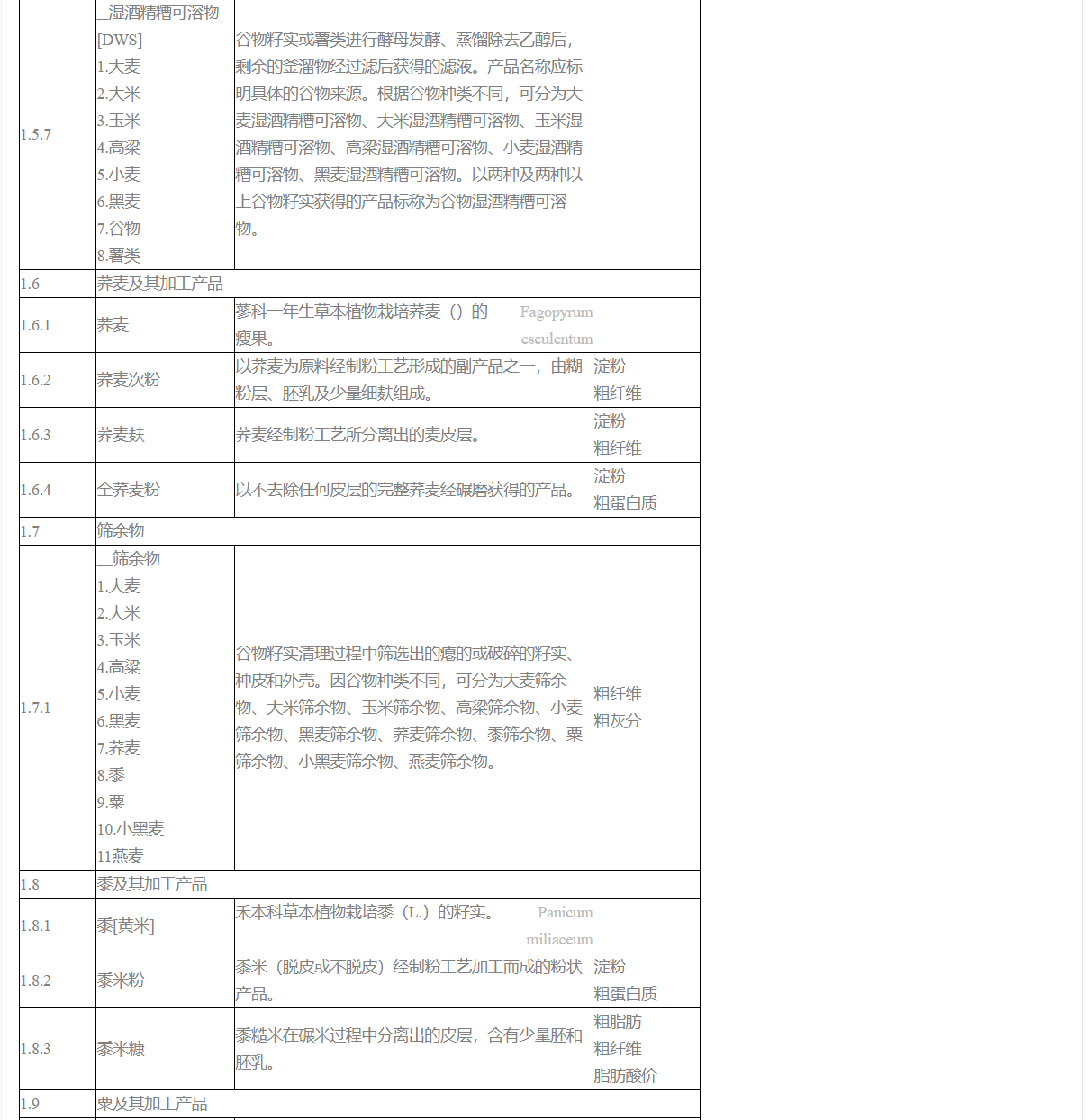 1. 大麥蛋白粉、大米蛋白粉、玉米蛋白粉、谷朊粉[小麥蛋白粉、活性小麥面筋粉]、干酒精糟[DDG]、干全酒精糟[DDGS]、干酒精糟可溶物[DDS]、干啤酒糟、干黃酒糟