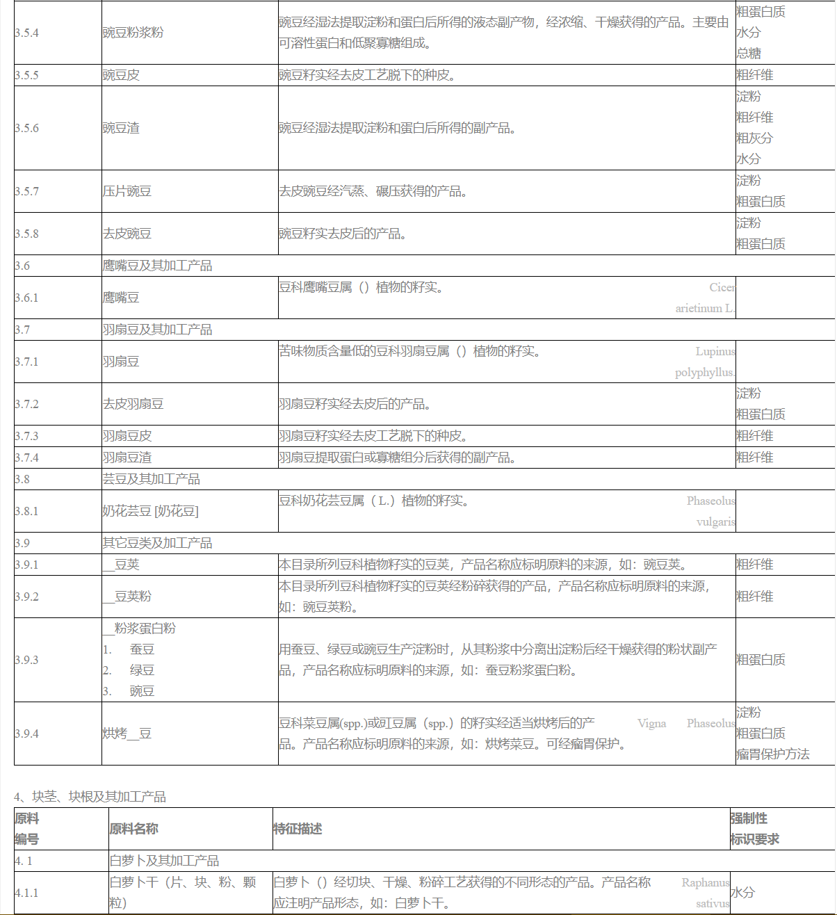 3. 飼料原料標簽中標識的產品名稱應與本目錄第三部分規定的“原料名稱”一致;配合飼料、濃縮飼料、添加劑預混合飼料以及精料補充料標簽中“原料組成”項目所使用的原料名稱也應與本目錄第三部分的“原料名稱”一致。“原料名稱”欄內方括號列出的為飼料原料的常用別名,可以與括號前的名稱等同使用。“原料名稱”欄內圓括號列出的為相關原料不同形態的物質,應根據產品實際進行選擇。