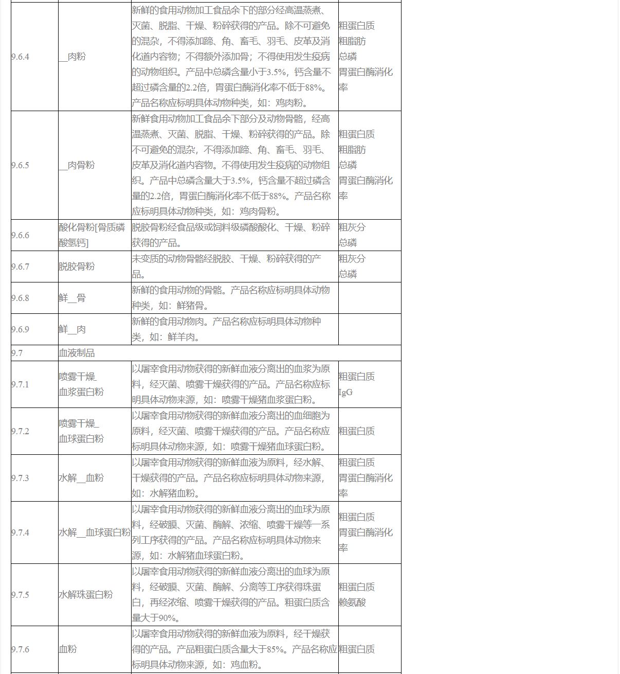 4. 肉粉、肉骨粉、骨粉(粒)、酸化骨粉、脫膠骨粉、明膠、骨膠原蛋白、動物內臟粉、禽爪皮粉、水解蹄角粉、腸膜蛋白粉、膨化羽毛粉、水解羽毛粉、水解畜毛粉、血粉、水解血粉、噴霧干燥血漿蛋白粉、噴霧干燥血球蛋白粉、水解血球蛋白粉、水解珠蛋白粉、血紅素蛋白粉、蛋粉、蛋黃粉、蛋清粉、蛋殼粉、動物油脂、動物油渣(粉)、