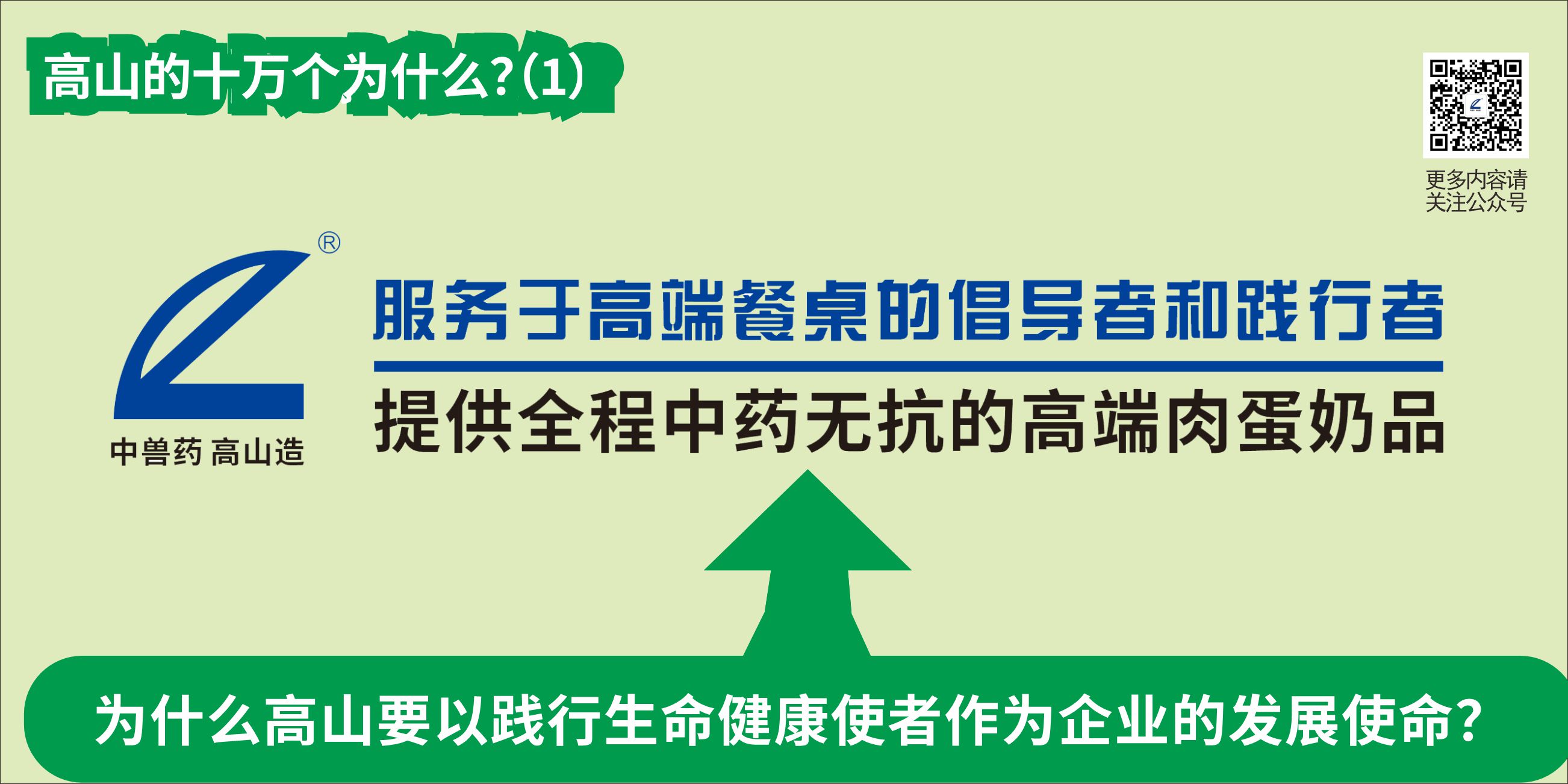 將中藥的疾病預防與中藥的功能保健應用于生產的全過程,實現更安全,更健康,更優質,為餐桌提供全過程中藥無抗健康養殖的高端肉蛋奶品,致力于成為服務高端餐桌的領導者和踐行者,為人類美好生活提供優質的肉蛋奶品,以踐行生命健康使者作為高山企業的發展使命,這一使命的形成和確立,具有著深厚的企業創始人背景、企業發展的品牌形成、企業文化的深厚底蘊和綜合因素確立,既是對中華中醫岐黃文化的傳承和弘揚,也是中獸藥在畜禽生產中的實踐與應用的重新定義,更是承擔社會發展責任、因應大健康產業發展趨勢和推動行業健康發展的現實體現。