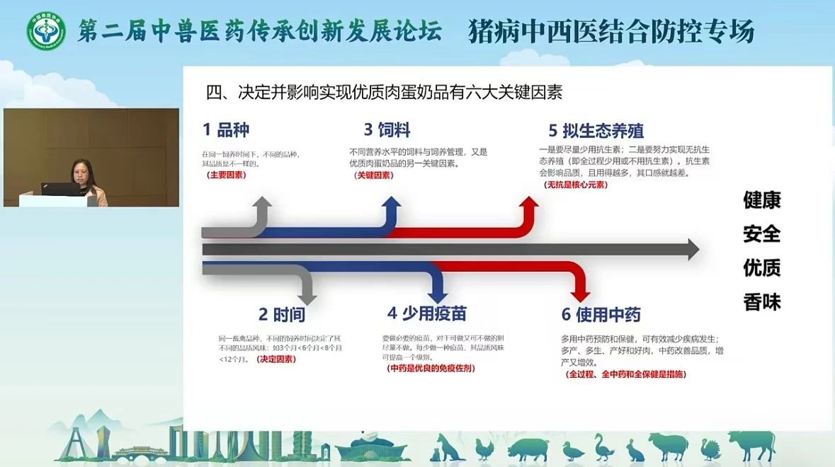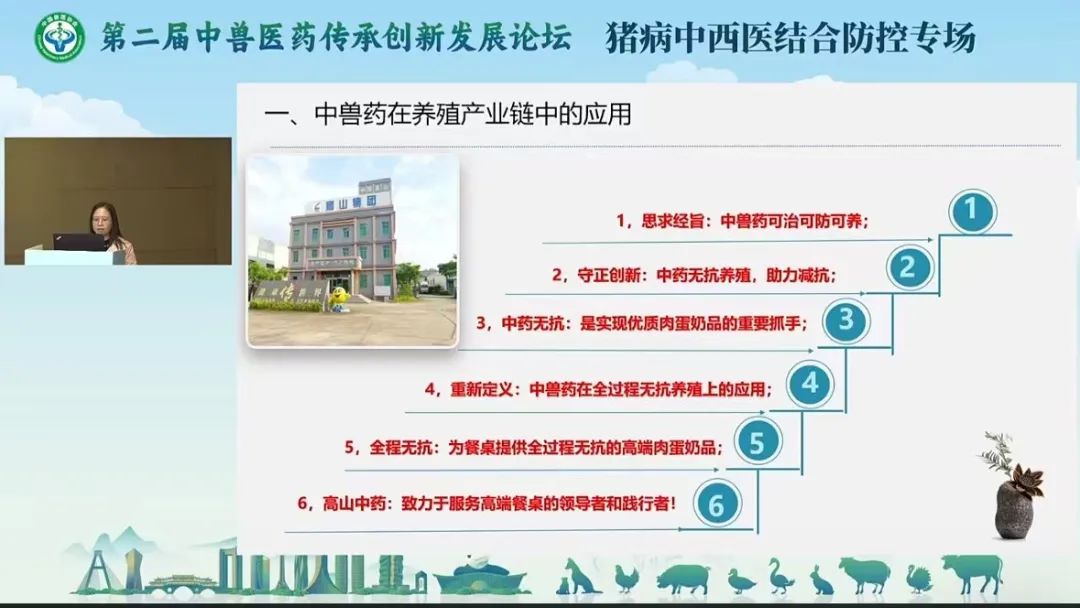 論壇上,高山集團營銷總監陳翠代表作《思求經旨,守正創新——中獸藥在全過程無抗健康養殖高端優質肉蛋奶品應用上的重新定義》報告。她指出,高山中獸藥致力于為餐桌提供全過程無抗養殖的高端優質肉蛋奶品,為人類美好生活提供健康的優質肉蛋奶品,這是中獸藥在全過程無抗健康養殖高端餐桌肉蛋奶品應用上的重新定義,包括全過程無抗養蛋雞、全過程無抗健康養豬、全過程無抗健康養閹雞、全過程無抗健康養鴿等。