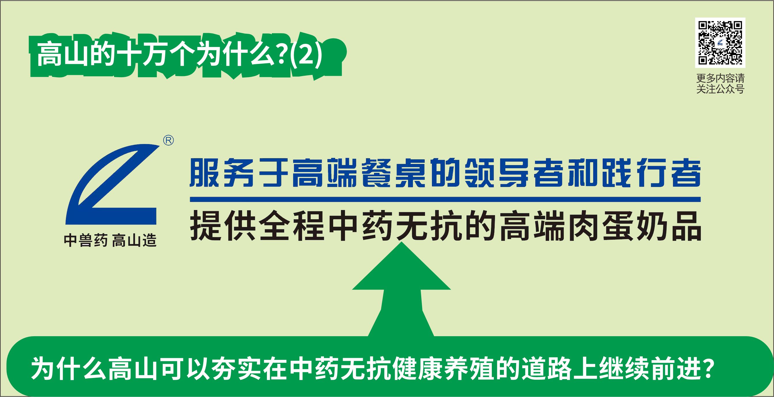 中獸藥,高山造。從創(chuàng)牌的第一天起,始終堅(jiān)守中藥大健康的養(yǎng)殖發(fā)展理念,傳承和弘揚(yáng)五千年的中醫(yī)岐黃文化,將中藥的疾病預(yù)防和中藥的功能保健應(yīng)用于生產(chǎn)中,從中藥治療到中藥預(yù)防到中藥保健,可以應(yīng)對(duì)抗生素要解決的畜禽疾病問題,也可以應(yīng)對(duì)抗生素所不能解決的所有生產(chǎn)問題,包括藥殘問題、免疫抑制問題等,有助于實(shí)現(xiàn)多產(chǎn)多生好生和產(chǎn)好,實(shí)現(xiàn)全過程中藥無抗健康養(yǎng)殖生產(chǎn)更安全更健康更優(yōu)質(zhì)的肉蛋奶品,以踐行生命健康使者作為企業(yè)的發(fā)展使命,并不斷滿足人們美好生活的優(yōu)質(zhì)肉蛋奶品需求,堅(jiān)定地走在減抗、替抗和無抗的大健康養(yǎng)殖發(fā)展道路上,致力于成為服務(wù)高端餐桌的領(lǐng)導(dǎo)者和踐行者。
