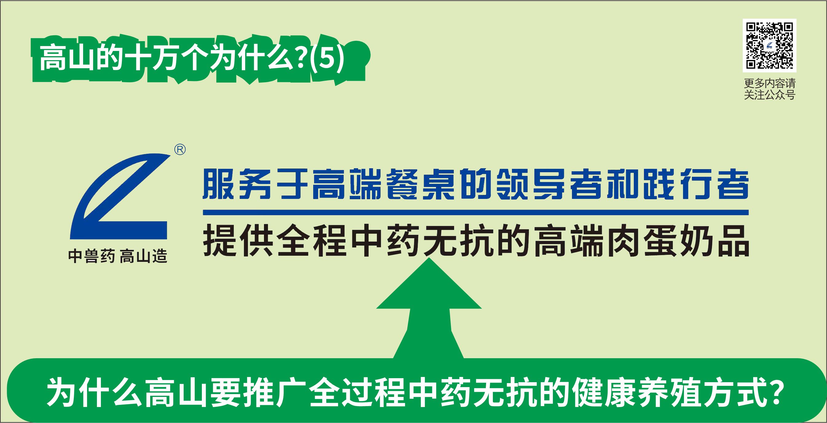 全過程中藥無抗健康養殖方式,是保障畜禽產品更安全、更健康、更優質和更高效的畜牧業發展的一條重要途徑,是生產優質肉蛋奶品的更高形式。鎖定5-10%的更注重定全、更注重健康和更注重品質的高端人群,為餐桌提供全過程中藥無抗健康養殖的優質肉蛋奶品,是高山秉承的“健康傳世界”養殖發展理念和發展初心,將中藥應用于畜禽生產,解除亞健康,減少疾病發生,促進生長發育,改善肉蛋奶品質,實現效益養殖。高山,始終堅持在無抗大健康養殖的發展道路上前進,而高山“3+1”措施是推廣和實現畜禽全過程中藥無抗健康養殖的實踐方案與路徑。