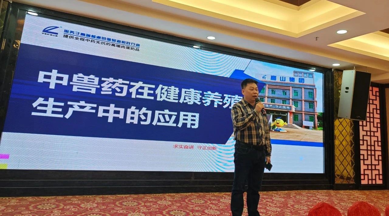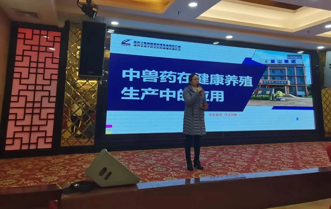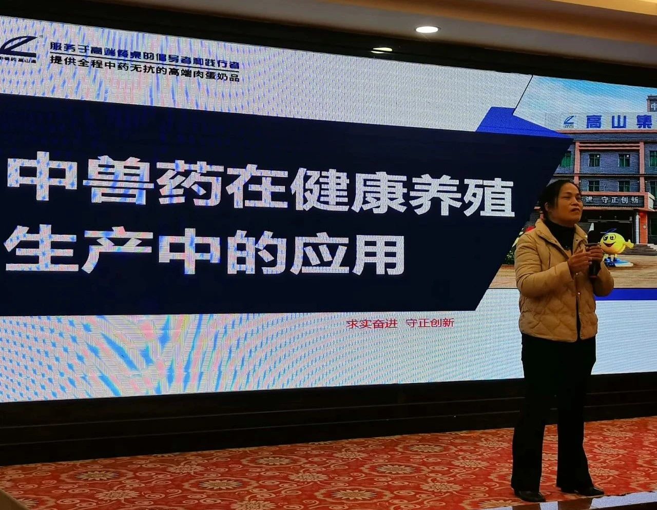 高山集團(tuán)商學(xué)院培訓(xùn)師鐘飛燕作《中獸藥在健康養(yǎng)殖生產(chǎn)中的應(yīng)用》報(bào)告,首先指出全過(guò)程中藥無(wú)抗健康養(yǎng)殖方式,是保障畜禽產(chǎn)品更安全、更健康、更優(yōu)質(zhì)的重要途徑,是生產(chǎn)優(yōu)質(zhì)肉蛋奶品的更高形式。其次講解了健康養(yǎng)殖的關(guān)鍵是在生產(chǎn)中多使用中藥進(jìn)行預(yù)防保健,比如使用金方15、高山大巴溶液等做好開(kāi)口保健;呼吸道問(wèn)題使用強(qiáng)力粵威龍+侯炏凈、腸道問(wèn)題使用料磺1號(hào)+高山粵威龍散;定期使用正冠樂(lè)提高免疫力與抗病毒能力,使用免增粵威龍有助于解除免疫抑制、補(bǔ)氣血等。
