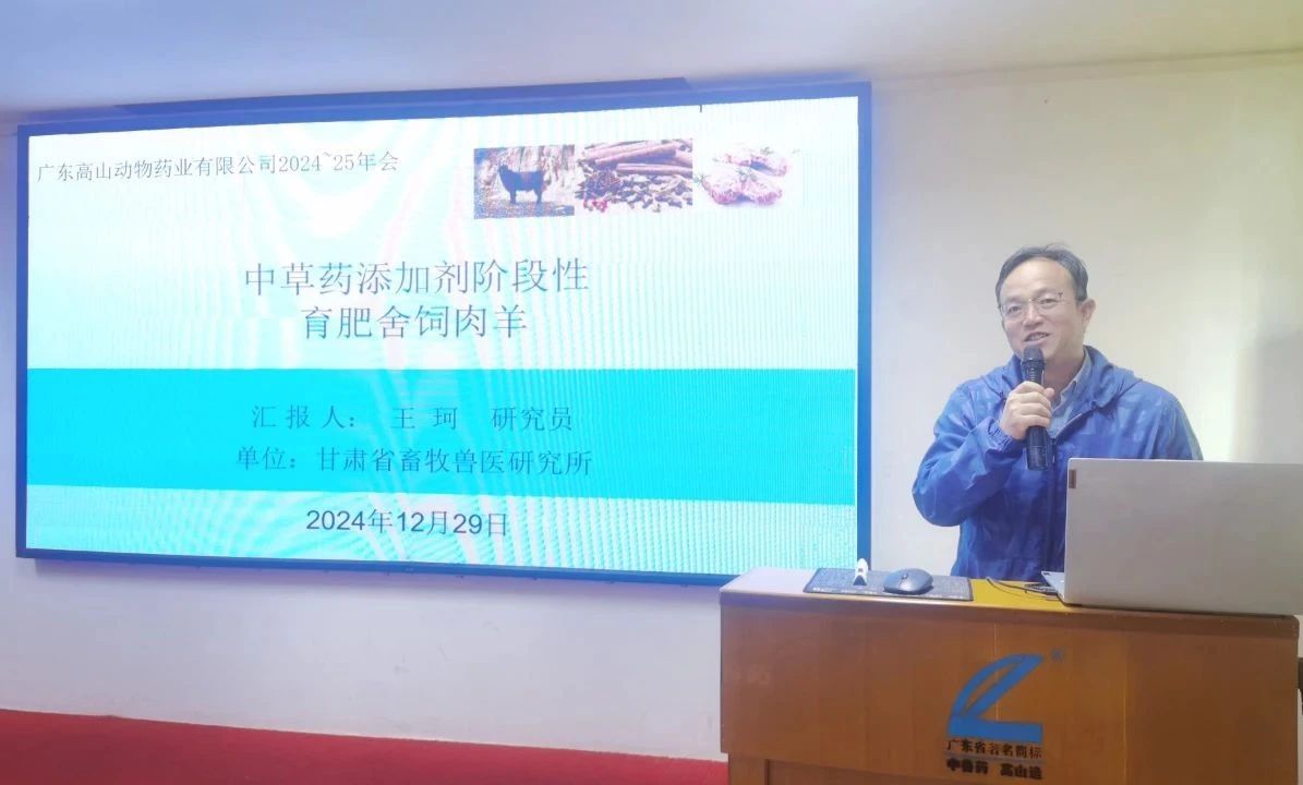 甘肅省畜牧獸醫研究所研究員王珂作《中草藥添加劑階段性育肥舍飼肉羊》報告,分別從我國現階段養羊狀況和結構、目前舍飼育肥肉羊存在的問題、中草藥添加劑育肥舍飼肉羊特色、目前舍飼肉羊育肥技術改進和我國肉羊行業發展趨勢預測作了詳細的講解,同時分享高山中藥三階段的育肥方案,選用的產品包括有:強力粵威龍、溫白三、料磺1號、免增粵威龍、高山粵威龍和驅蟲健胃的弓蟲粵威龍、育肥增重用肥大康等,并總結分析育肥效果,肯定了中草藥的特色是可以提高肉羊免疫力,改善肉質口感,促進生長發育。他推薦在出欄前使用肥大康2kg/噸料,連用60天。
