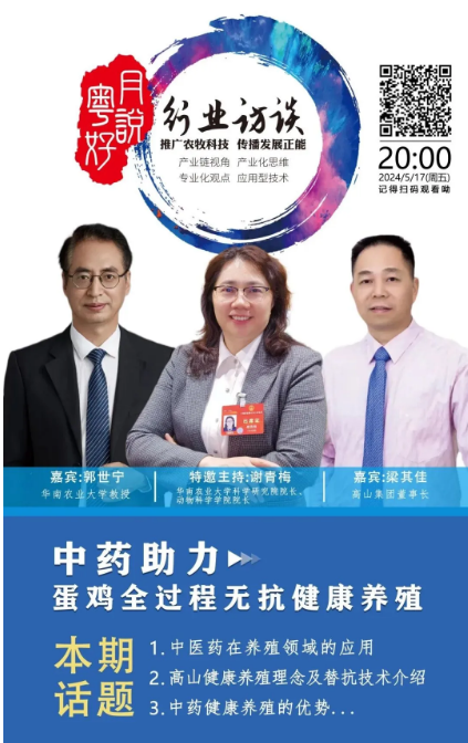 2024年5月17日,《月說粵好》欄目由華南農業大學科學研究院院長、動物科學學院院長謝青梅教授主持,做客嘉賓為高山集團董事長梁其佳和華南農業大學郭世寧教授,圍繞“中藥助力蛋雞全過程無抗健康養殖”主題進行了深入探討。