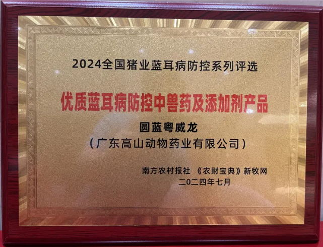 2024年7月13日,圓藍粵威龍在“2024 匠心種豬系列評選/藍耳病防控系列評選”中,榮獲十大藍耳病防控中獸藥及添加劑產品殊榮稱號。