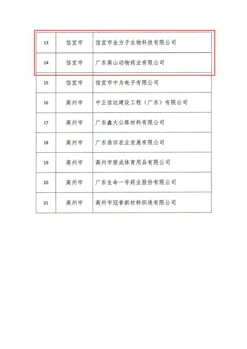 熱烈祝賀高山集團骨干成員企業廣東高山動物藥業有限公司和信宜市金方子生物科技有限公司于2025年2月被評為2024年茂名市專精特新中小企業榮譽稱號。