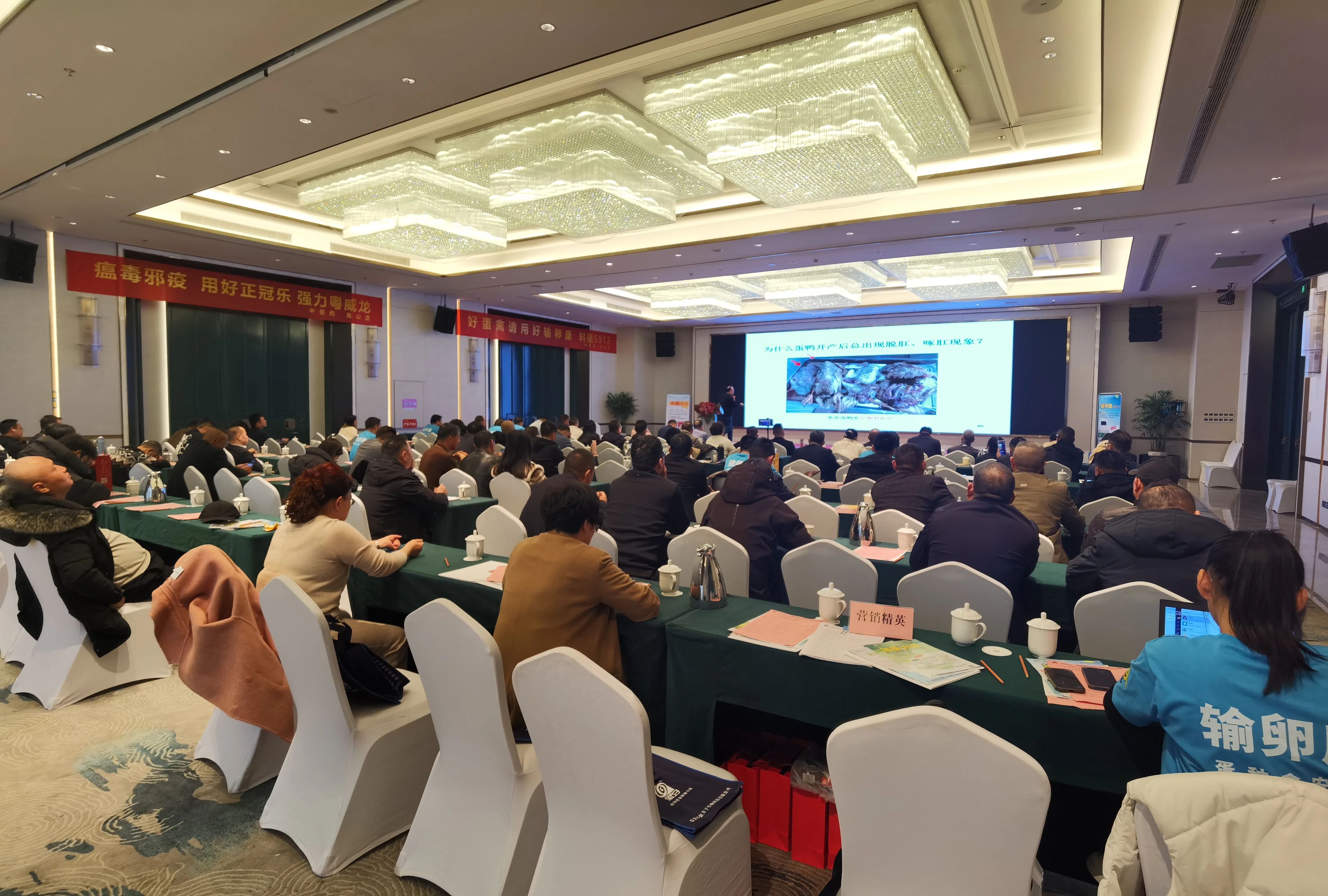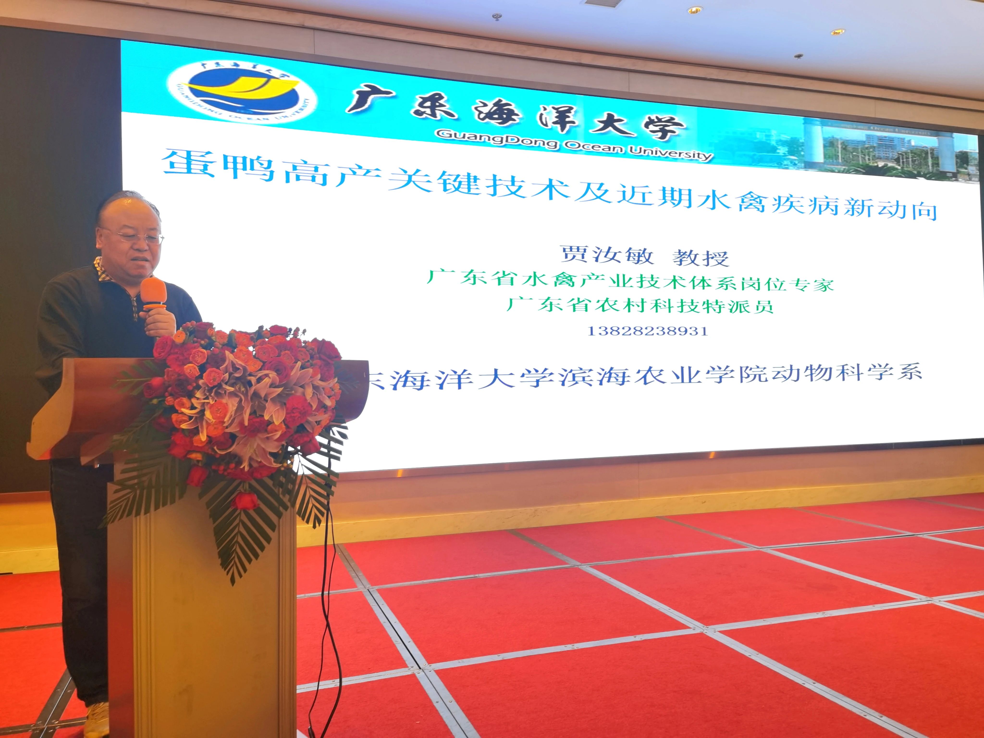 廣東省水禽產業技術體系崗位專家、廣東省農村科技特派員、廣東海洋大學濱海農業學院動物科學系賈汝敏教授作《蛋鴨高產關鍵技術及近期水禽疾病新動向》報告,首先詳細介紹我國蛋鴨產業現狀和蛋鴨的品種,深刻剖析蛋鴨的標準化養殖技術,同時指出蛋鴨養殖面臨的主要問題及原因是產蛋量不高、平均體重不夠、整齊度不好、產蛋高峰期短、發病多發病急、蛋鴨淘汰早、養鴨不掙錢和籠養蛋鴨,講述了蛋鴨高產穩產的關鍵是全程使用高山中藥無抗大健康養殖預防保健方案。同時指出,水禽近期病毒性疾病呈現出多發趨勢,并從呼腸孤病毒病和禽流感的發病特點、主要癥狀和病理變化特征作了詳細的分析,最后分享水禽病的防控是一項系統工程,要從“養、防、檢、治”做好防控,特別是使用中藥做好定期預防,例如呼腸孤病毒病用加曼六康,禽流感用正冠樂、免增粵威龍、雙黃連散等。