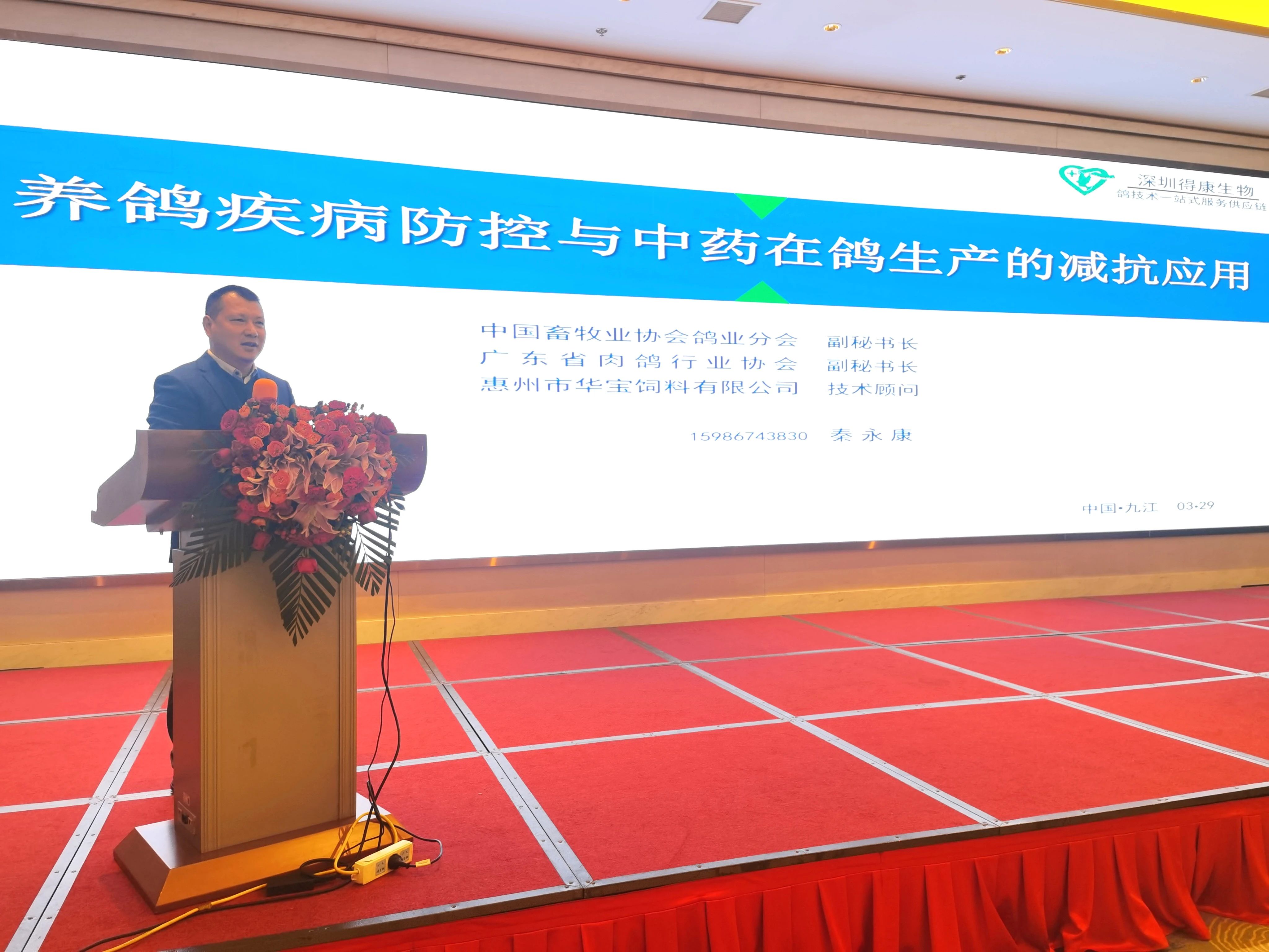 中國畜牧業協會鴿業分會副秘書長、廣東省肉鴿行業協會副秘書長秦永康作《養鴿疾病防控與中藥在鴿生產的減抗應用》報告,首先講解乳鴿的品種、管理模式、營養來源和養鴿自動化趨勢,并分享乳鴿和青年鴿多發疾病的中藥應對方案,如黑肚子病用高山大巴溶液、料磺1號溶液、黃白先鋒溶液和藿香正氣口服液;細菌型疾病用料磺1號、真菌磺、青蒿末、弓蟲粵威龍和黃白先鋒溶液;病毒型疾病用正冠樂、強力粵威龍和侯炏凈;最后指出,減抗與無抗養鴿是大勢所趨,是形勢要求,也是市場的需要。