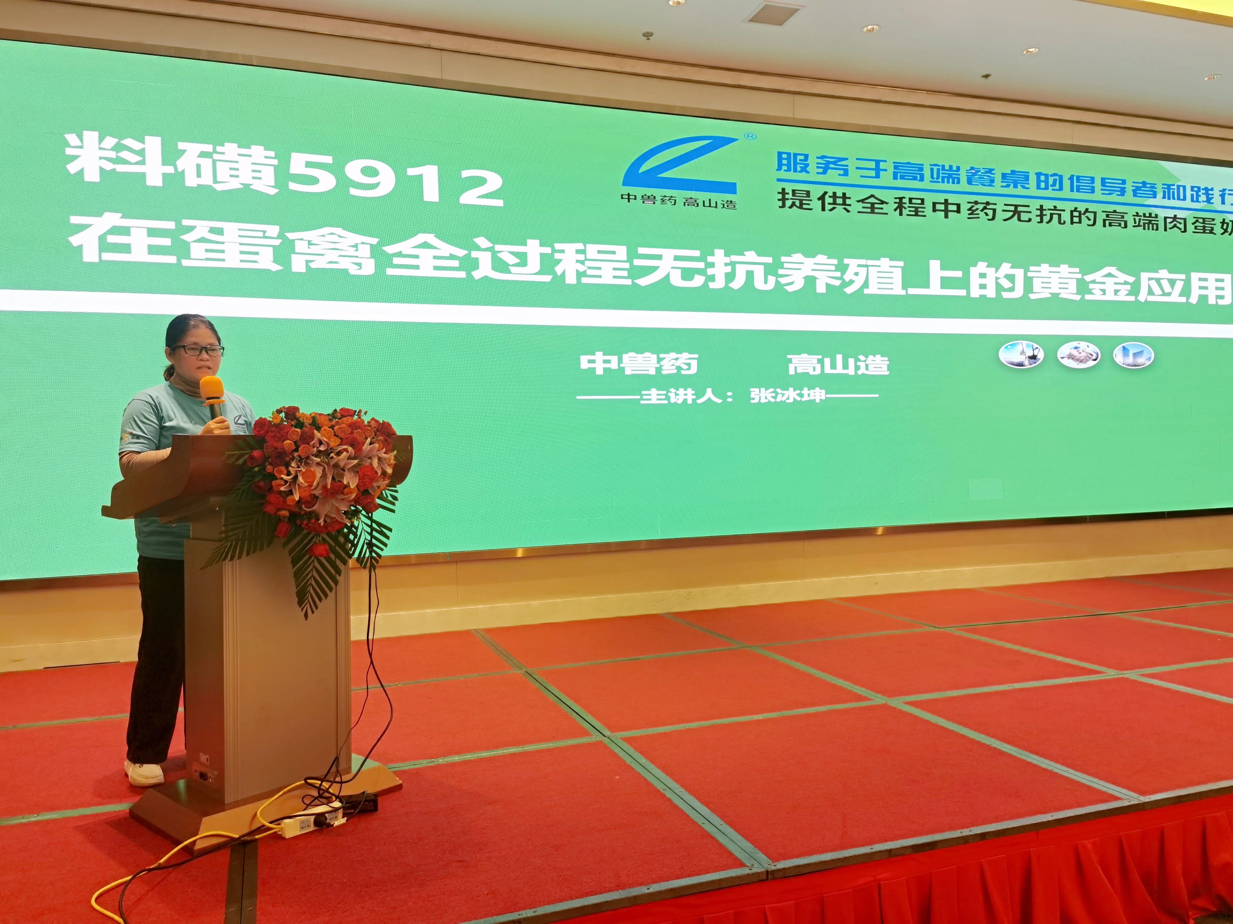 副高級獸醫師,高山集團技術中心副總經理兼研發總監張冰坤作《料磺5912—在蛋禽全過程無抗養殖上的黃金應用》報告,首先講解蛋禽養殖行業的現狀痛點,并從料磺5912的特點、產品配方、生產工藝、作用機理、臨床價值和脈沖式使用作了詳細的講解,同時分享東東蛋業、山東、江西等地全過程無抗健康養殖的實證案例,最后講述蛋禽養殖重點關注高山1+N脈沖式用藥,即料磺5912+輸卵康+免增粵威龍+小柴胡顆粒+六康+強力粵威龍或正冠樂。