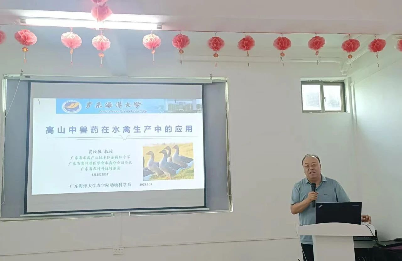 會上,廣東省水禽產業技術體系崗位專家、廣東省農村科技特派員、廣東海洋大學濱海農業學院動物科學系賈汝敏教授作《高山中獸藥在水禽生產中的應用》報告,首先講解當前水禽呈現多種病毒混感、病毒與細菌混感的流行特點,同時剖析水禽的常見疾病,同時指出,水禽近期病毒性疾病呈現出多發趨勢,并從呼腸孤病毒病、禽流感、副黏病毒病、安卡拉病和水禽痛風的發病特點和主要癥狀作了詳細的分析,并要從“養、防、檢、治”做好防控,特別是使用中藥做好定期預防,例如呼腸孤病毒病用加曼六康,禽流感用正冠樂、免增粵威龍和雙黃連散,副黏病毒病用正冠樂、黃芪多糖口服液和雙黃連口服液,安卡拉病用心型正冠樂和免增粵威龍散,水禽痛風用風道液和安黃舒等。最后分享暑熱應激下水禽養殖存在的問題及對策建議。