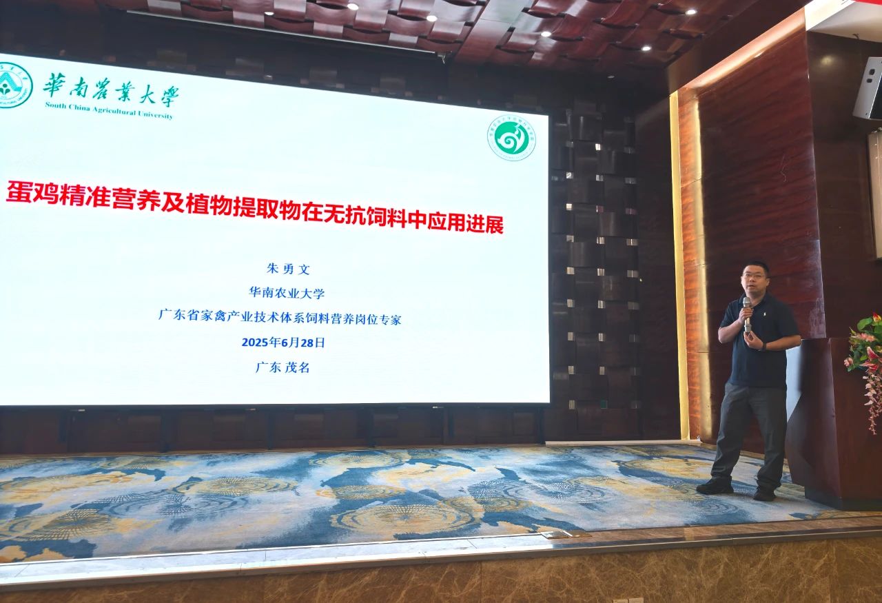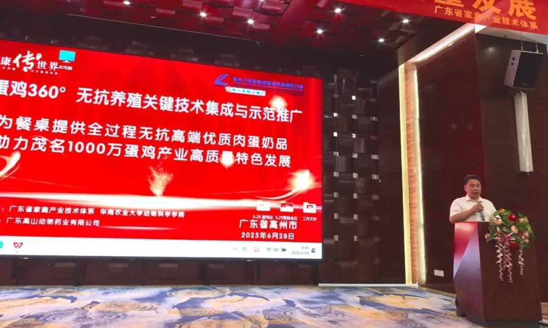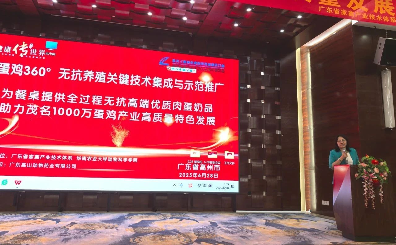 2025年6月28日,由廣東省家禽產(chǎn)業(yè)技術(shù)體系與華南農(nóng)業(yè)大學(xué)動物科學(xué)學(xué)院聯(lián)合主辦,廣東高山動物藥業(yè)有限公司協(xié)辦的《蛋雞360°無抗養(yǎng)殖關(guān)鍵技術(shù)集成與示范推廣大會》在茂名高州市樂天溫泉酒店圓滿召開,大會以“為餐桌提供全過程無抗高端優(yōu)質(zhì)肉蛋奶品,助力茂名1000萬蛋雞產(chǎn)業(yè)高質(zhì)量特色發(fā)展”為主題,匯聚行業(yè)智慧,探討無抗養(yǎng)殖技術(shù)創(chuàng)新與產(chǎn)業(yè)升級路徑。院校專家教授、行業(yè)協(xié)會代表、相關(guān)部門領(lǐng)導(dǎo)、規(guī)模蛋禽養(yǎng)殖企業(yè)代表、客戶嘉賓、高山集團(tuán)營銷經(jīng)理和公司管理人員等近130人參加。大會由商學(xué)院執(zhí)行院長鐘飛燕主持。