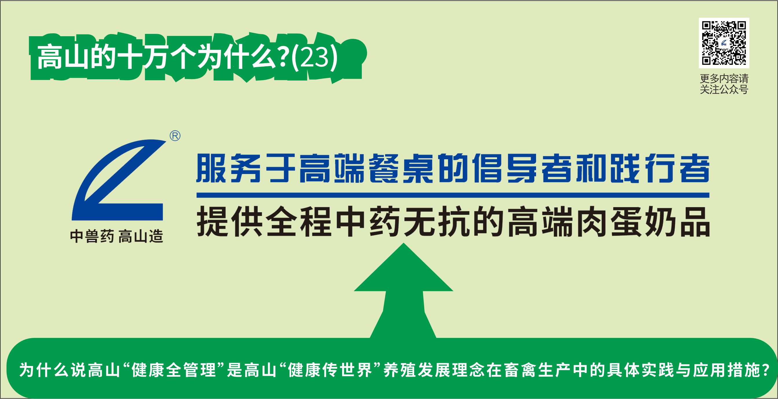 高山的“1 + 3 + 1”中藥無抗健康養殖保健方案、《蛋雞全過程中藥無抗健康養殖技術規范》、《三黃種雞全過程中藥無抗健康養殖技術規范》、《三黃閹雞全過程中藥無抗健康養殖技術規范》、《全過程無抗健康養殖產業創新基地》示范場活動和高山“3+1”措施助力全過程無抗健康養殖等,都是“健康全管理”的實踐成果,也是“健康傳世界”養殖發展理念在畜禽生產中的具體實踐與應用。通過這些實踐,高山致力于為餐桌提供全過程中藥無抗健康養殖的高端肉蛋奶品,踐行生命健康使者的使命。