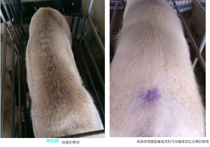 結論反饋:連續使用7天后,皮毛和黑斑改善,同時再用圓藍粵威龍不間斷使用,7天后沒有黑斑,母豬皮毛紅亮、健康度提高、老板對圓藍粵威龍和弓蟲粵威龍非常認可。