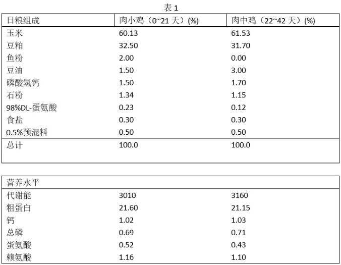 試驗分為肉小雞(0-21天)和肉中雞(22-42)天兩個階段。試驗雞籠養(yǎng),飼喂干粉狀飼料,自由采食和飲水,每天24h光照,溫度控制在34℃-35℃,每周下降2℃,最終溫度控制在20℃-26℃,相對濕度45%-55%。基礎日糧營養(yǎng)水平參考中華人民共和國農業(yè)行業(yè)標準配合而成,其組成及營養(yǎng)水平(見表1)試驗期間記錄采食量,21d和42d稱體重。計算平均日采食量、平均日增重量和耗料重比。