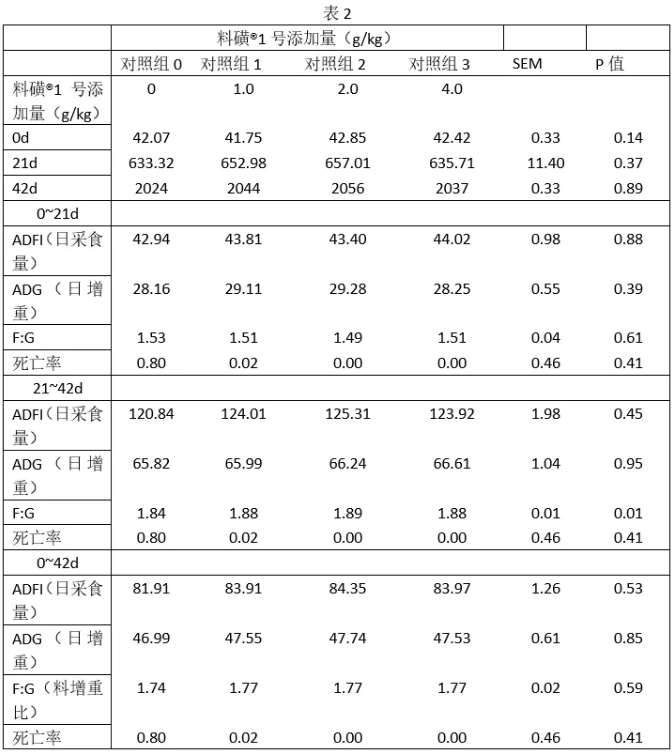 與對照組(不添加料磺1號,添加抗生素)相比商品肉用雞日糧添加料磺1號,均能提高肉用雞增重,增加采食量,降低料重比,均能獲得與對照組一致的生產性能(表2)。