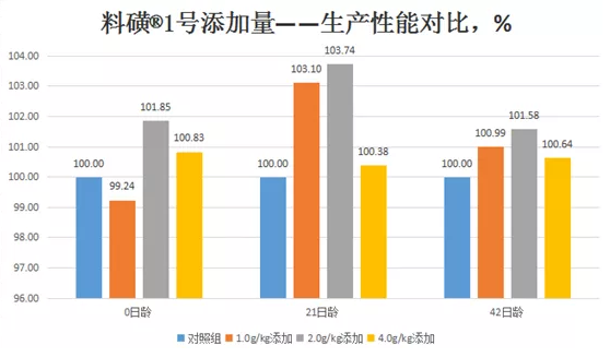 3.2與對照組相比,試驗組商品肉雞在(1-21d)/(21-42d)在死亡率方面略有下降,無顯著差異(P>0.05),說明料磺1號在試驗添加量(1.0、2.0和4.0g/kg)可獲得與對照組一致的生產性能,在肉雞的日常飼養(yǎng)方面具有替代抗生素,一定程度的減少疾病發(fā)生作用。